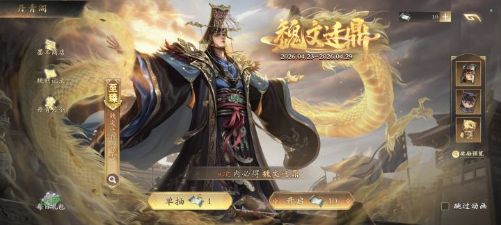 差点忘记今天更新了哈哈其实曹丕出来的时候我就很期待他的皮肤,我很喜欢他原皮给我的感觉,虽然吧,这个皮肤给我一种ooc了的感觉但是我的曹丕大人必须得有一套华丽的衣服好吧,拿下拿下必须拿下哦对了,我保底了,靠,真保底,那个卡牌还有框我都没抽到,80抽就一个皮肤,这就是对我上个奖池12抽全出的惩罚吗,呜呜呜呜呜呜呜