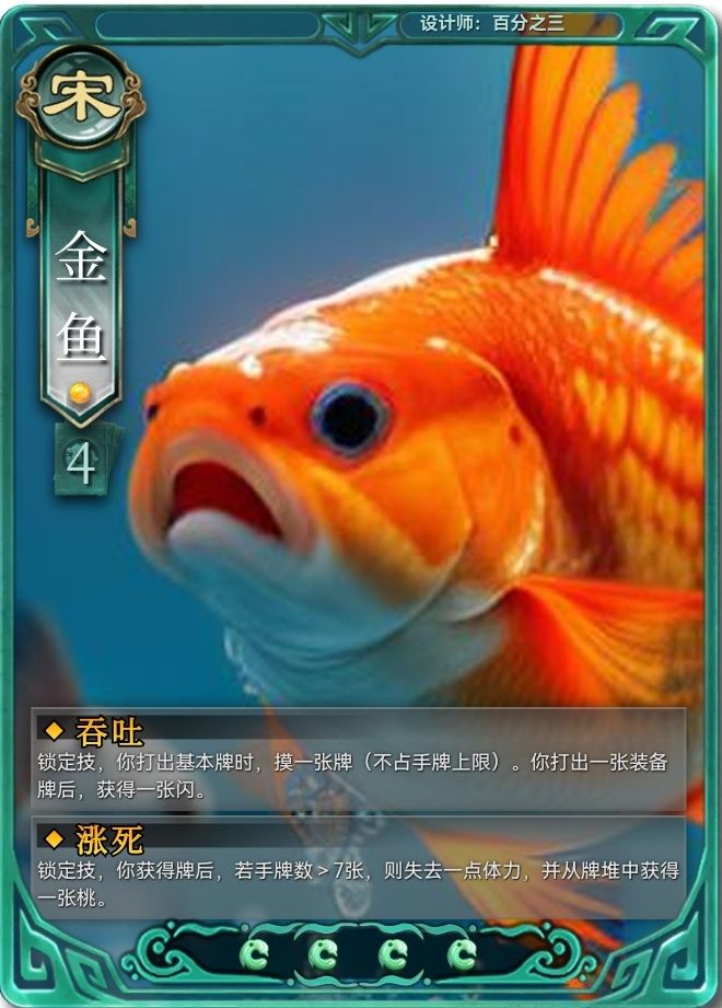 一种最常见的观赏鱼。金鱼吃东西时表现出了贪婪,同时他也不知道自己为啥而活着。金鱼七秒记忆,当手牌数果果时,则会崩死自己,同步性获得桃子(金鱼生存能力很强),直到牌堆中没有桃子为止。