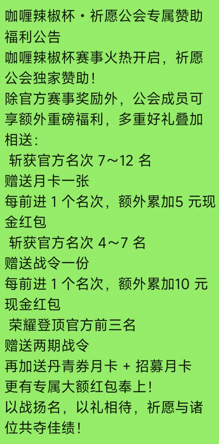 第一届辣椒杯比赛要开始啦!大家有兴趣的可以来参加一下,说不定比赛大将就花落你家了。此外,祈愿公会对这次比赛会有额外奖励!!!欢迎各位大佬参加我们公会。具体奖励请观看图片