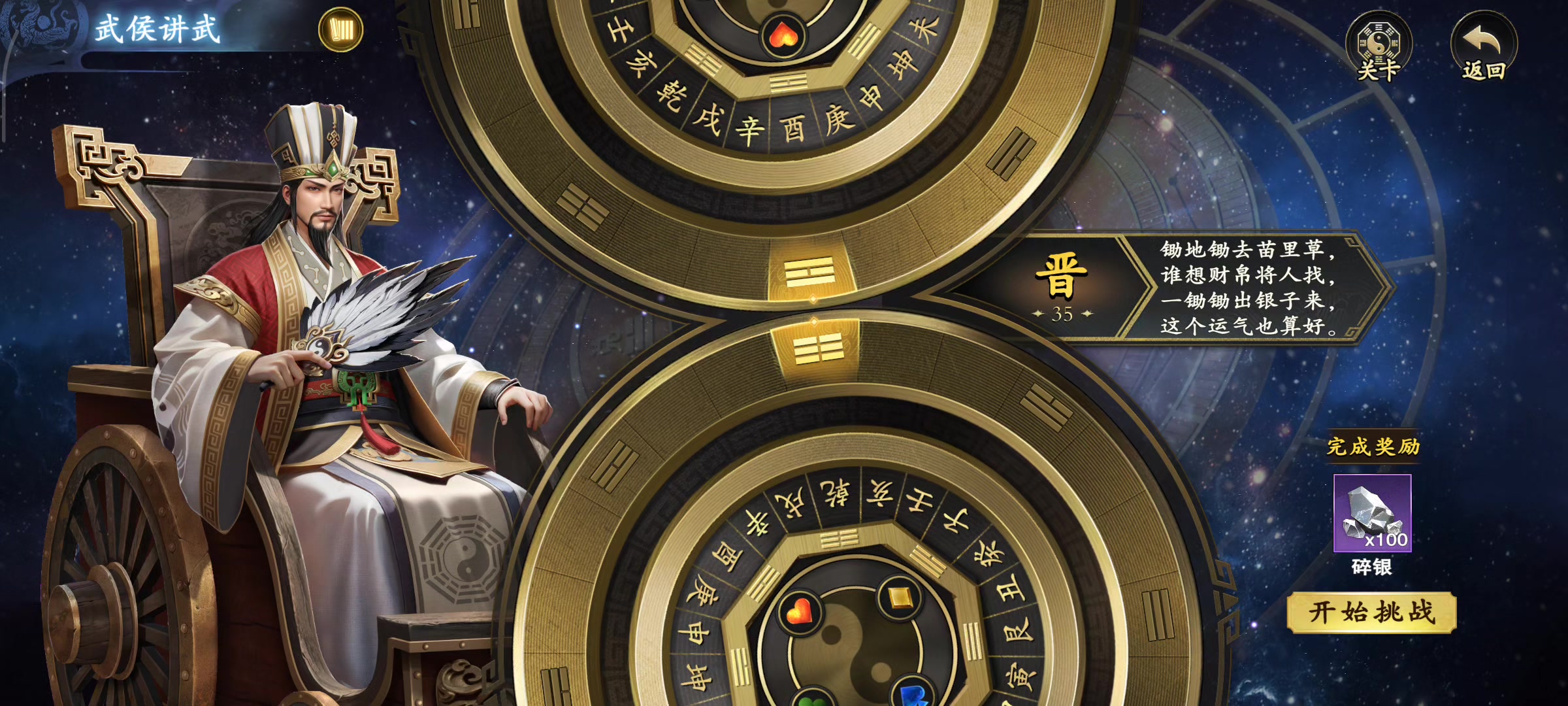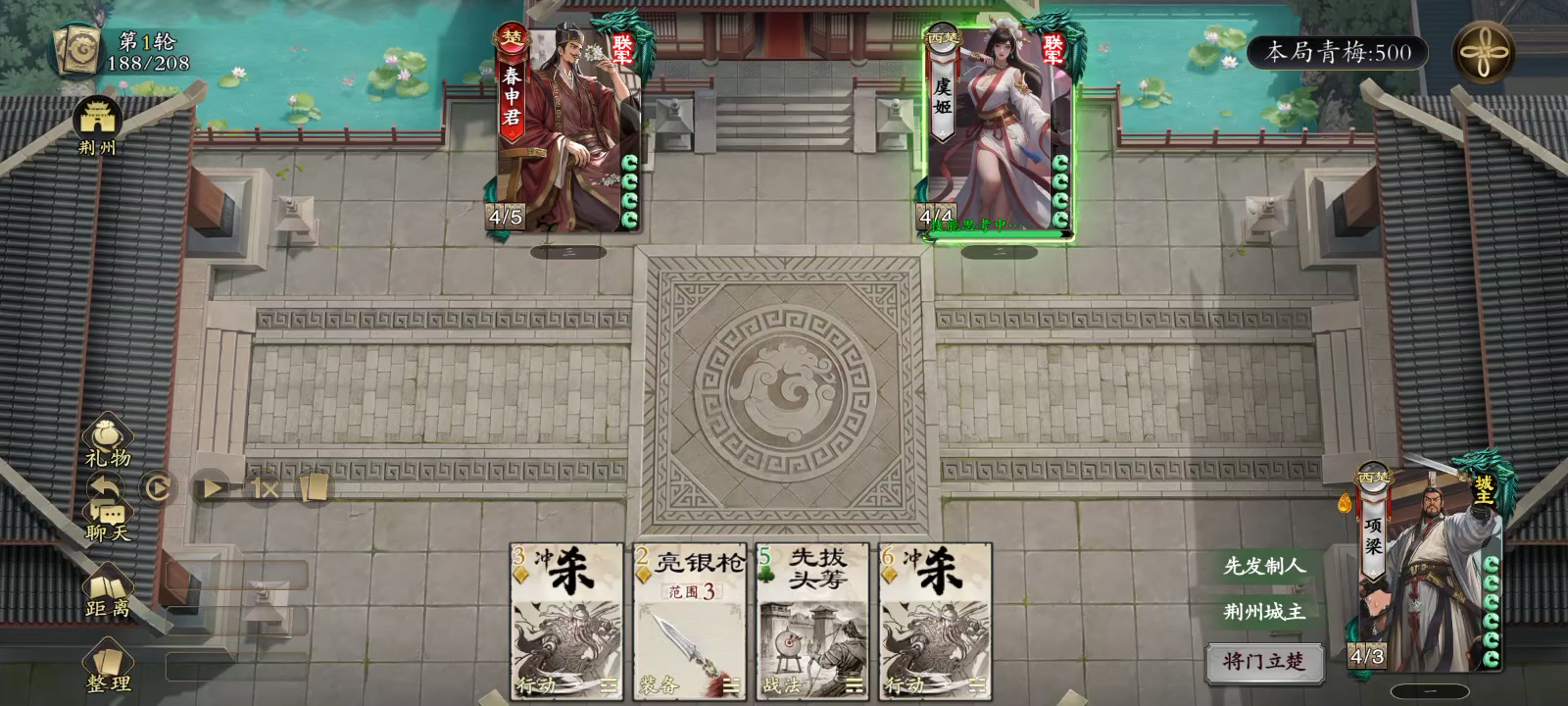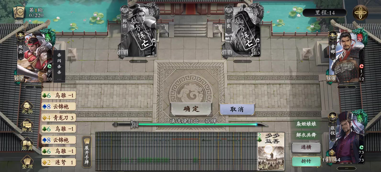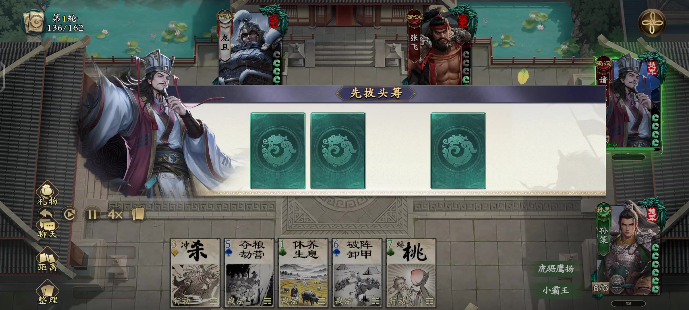 【35】晋 ①对韩信使用顺手牵羊,获得银狮盔,装备银狮盔,回1血; ②对韩信使用借刀杀人,己方掉血触发技能“乱世奸雄”获得1张杀,注意这张杀不能马上使用。再对韩信使用借刀杀人,获得装备惊羽弓。装备惊羽弓,对韩信打出杀,获胜。 这是之前查到攻略,可我这没有借刀杀人啊[表情_暗中观察]#名将杀 #名将杀武将 #名将杀攻略