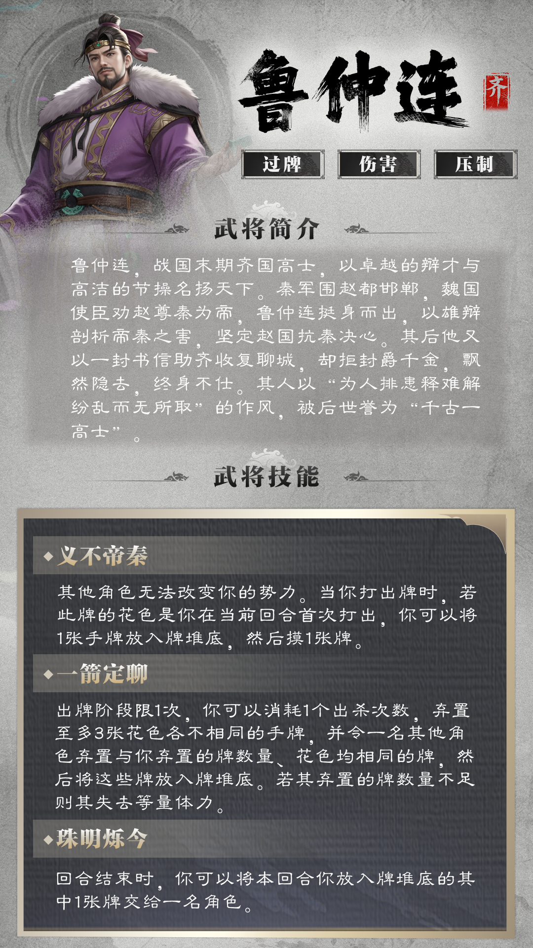 鲁仲连 5手牌 4体力上限 齐 稀有义不帝秦其他角色无法改变你的势力。当你打出牌时,若此牌的花色是你在当前回合首次打出,你可以将1张手牌放入牌堆底,然后摸1张牌。一箭定聊出牌阶段限1次,你可以消耗1个出杀次数,弃置至多3张花色各不相同的手牌,并令一名其他角色弃置与你弃置的牌数量、花色均相同的牌,然后将这些牌放入牌堆底。若其弃置的牌数量不足,则其失去等量体力。珠明烁今回合结束时,你可以将