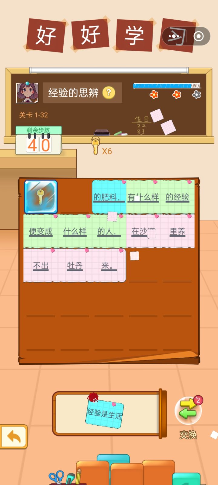 是的,遇到这种情况,只能分三步解决了如果没有冰块,前面只剩下一个位置时,就可以单击“的肥料,”来选中所有文字,然后整体向后移动,来给“经验是生活”腾出两个位置,但是第一格是冰块,所以只能先消除冰块了。