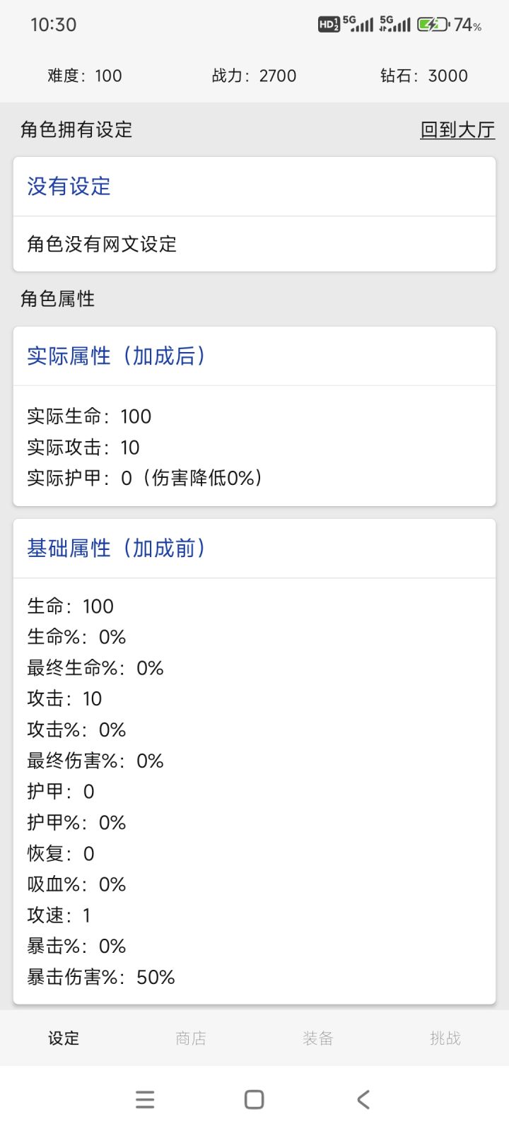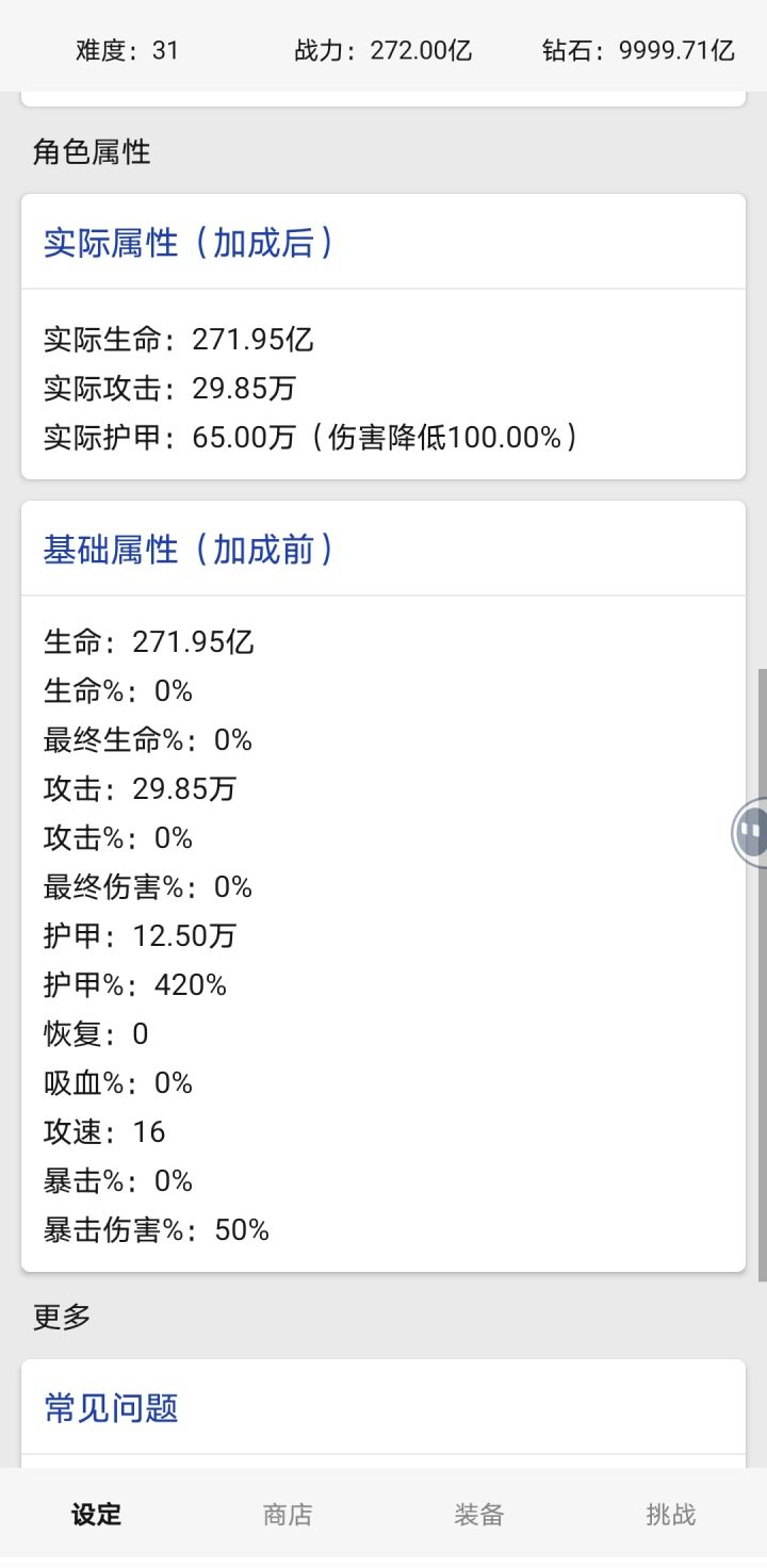 体验了一下设定拉满,100难度,有个疑惑,每攻击一次+1000永久生命那个设定有问题,说是永久,但是过关一次就重置了,并不是加到最大值上面的,几个设定里面最好用的应该是万亿钻石,直接装备拉满,其他的并没有无限叠加的设定,玩两次大概就腻了,中规中矩数值游戏