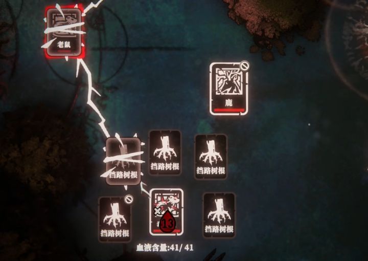 当然,扩张之路可不简单,除了路上的枯枝与石头会阻挡玩家的路线,还有会啃咬根系的财狼,玩家可以通过不同的卡牌效果一一化解。这就不得不提到游戏中的一个重要机制“牌组”,玩家可以在地图里收集到卡牌加入到牌组中,也可以花费一定量的血液来开包,一次可以获得三张随机卡牌,可能是阻挡玩家的石头,也可能是照亮前方的萤火虫。