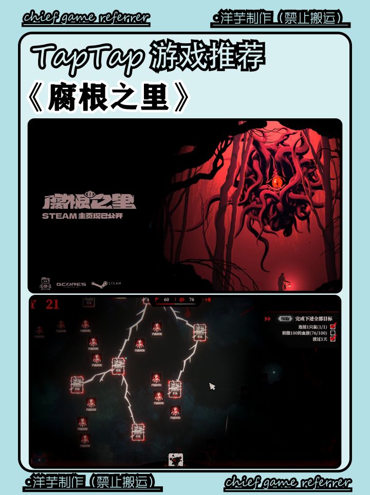 《腐根之里》是一款拥有克苏鲁、肉鸽要素的策略卡牌游戏,玩家将扮演一位由众多邪教徒献祭护林员等生物而召唤出来的古神,刚开始很虚弱需要不断吞噬血液来延展根系,从而了解或听到生物之间的交谈,找到并吞噬生物吸取血液滋养自己,之后探索地图。每个小区域都有祭台,开局可选择出生点,还有各种npc,比如林中鼠和猫头鹰,总得来说内容很丰富,玩法很独特。开局一颗树,成长全靠吸游戏有着肉鸽要素,每当水分或血液不足时
