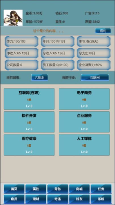 这是一款模拟上班打工积累财富,然后通过合理的运营,加上把握机遇,冒险,最终成为人生赢家的游戏,欢迎大家体验,提供意见和建议