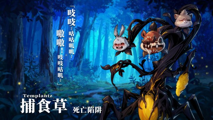 「喜欢可爱的小动物吗~它也喜欢~」 【基础信息】学名:捕食草分布区域:经常出现于赫尔大陆各大森林与山脉中。【物种特征】✧外形:锋利且灵活的枝桠会将小动物捕获,然后串起它们的头颅引诱其他猎物。✧种群特性:身体平时会深埋土下,如同植物一样静止,难以察觉。✧特殊能力:会控制小动物头颅的发声器官模拟叫声,以吸引其同类靠近并捕食。✧威胁等级:★★★★☆✧捕食草同类中会针对小动物头颅的完
