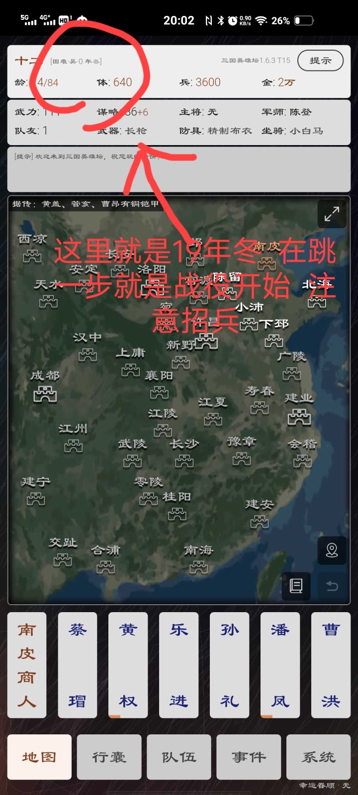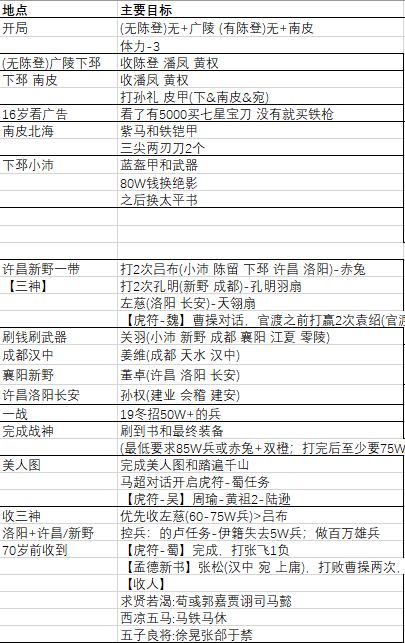 广陵开局 进去看有没有陈登 有就开局 然后 广陵下邳跳 交谈潘凤陈登 黄权 潘凤需要长剑 可以打出来 打不出来 买一个 注意跟随条件 (注:有3收藏和500陈登可以直接南皮开局打出皮甲就开局然后下邳南皮跳)收了陈登后就可以下邳 南皮跳 收潘凤 黄权 顺便打孙礼 皮甲 然后16岁 看广告 看了有5000买七星宝刀 没有 就买铁枪 然后南皮北海跳 打锦袍 铜铠甲 双铁锤 三尖两刃刀 出了 一个 就打 袁术紫马 和铁铠甲 出了就看 有没有三尖两刃刀 有2个 (只有一个可以北海买一个 卖掉之前爆的铜铠甲这些买)就可以跳到下邳 铁匠合个亮银枪 然后下邳小沛 跳 打刘备 这些能打过的 爆了 就卖掉之前的装备 招兵1.5万左右 然后就可以8成6成 损兵 打关羽张飞 吕玲绮 爆出来方天这些 至少要一个青龙偃月刀(注 :以上这些都要在20左右岁完成)爆了 就可以直接去许昌新野 打2次吕布 2次孔明 顺便打董卓这些有好装备的 打了就直接成都汉中刷钱 刷神器 10年之前出赤兔 就可以直接去打左慈 应该可以打4次左右 刷钱没出就不管继续刷钱 19年冬就可以卖掉装备 招兵(注:把兵控制在4000以内最便宜 )然后至少有50万+兵力 直接新野许昌跳打吕布孔明关羽(注:前期姜维爆了连弩 这里孔明就可以直接交谈)吕布赤兔爆率高 有赤兔了(注:赤兔最好2战前爆出来没爆请重开)就直接跳到洛阳长安跳 打左慈 吕布 各打了8次 就可以做美人图有了图 然后收人 先收左神仙比较好 注意前期爆了天羽扇不要卖了 (注意:以上都是随便写的 不懂可以加群 问我 有空会讲解)