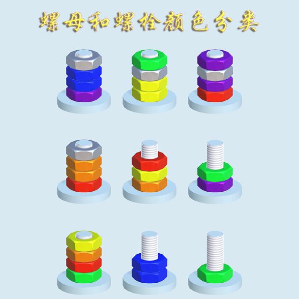 螺母和螺栓颜色分类是一款益智类游戏,在游戏中,玩家面临带有不同颜色的螺母,目标是将相同颜色的螺母进行正确的配对。