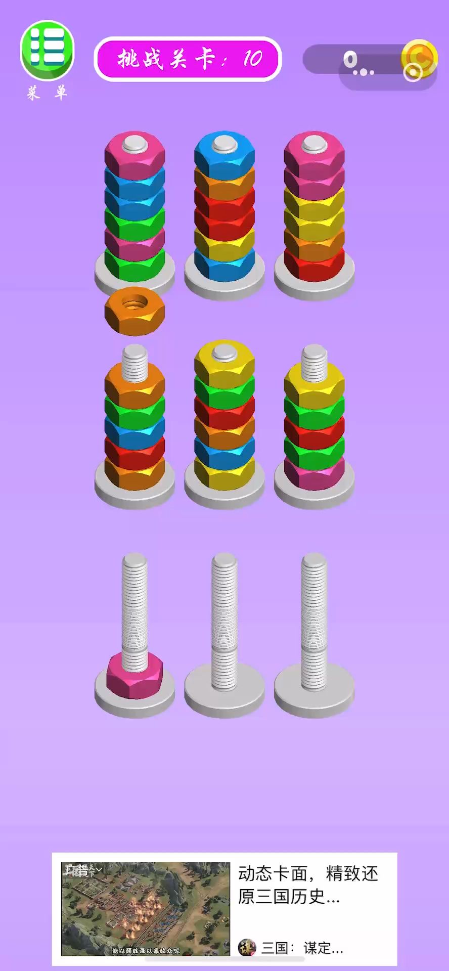 各位军师,螺母和螺栓颜色分类第10关的通关攻略来了,依旧是轻松拿捏斜眼笑[表情_斜眼笑] #螺母和螺栓颜色分类