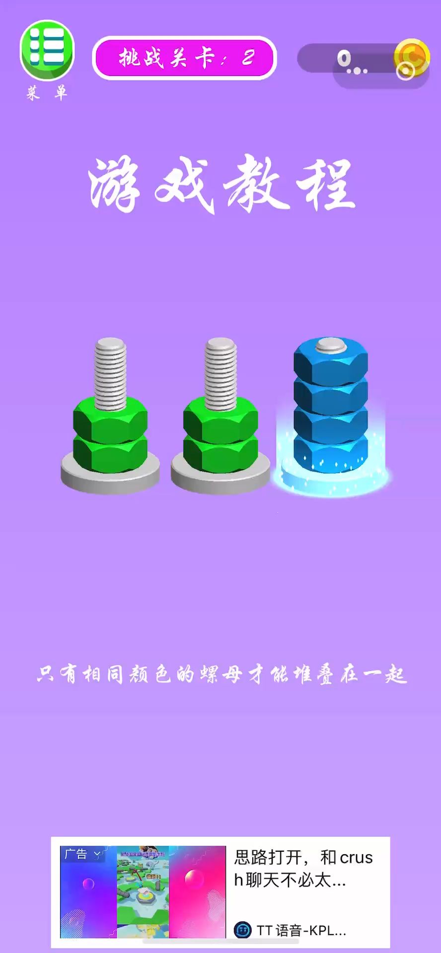 各位军师,第二关还是教程关,一看就会的那种看我的[表情_看我的]#螺母和螺栓颜色分类
