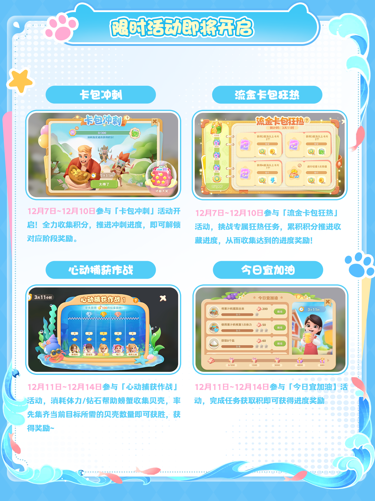 🌊各位冒险家,准备好与噗噗一同潜入碧波之下,开启海底的探险了吗?这次,让我们与伙伴一同潜入海底闯关乐园,再登陆那片被毛茸茸包围的治愈小岛——「猫狗岛」现在,就让我们带上期待,一同驶向这场集结了激情冲刺与温柔陪伴的双重冒险吧!🐾全新限时活动岛屿「海岛冲冲冲」&「猫狗岛」即将欢乐开启!- 全新限时剧情同步开放!在海上赛道挥洒热情,在萌宠乐园邂逅暖心陪伴。- 开启双岛限时故事剧情,即可前往「捕