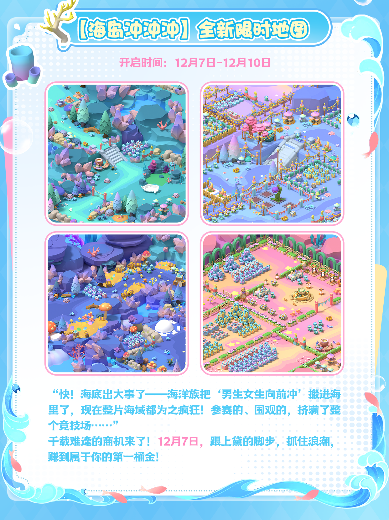 ❄天公宁低巧,剪水作冰花不知不觉,噗噗和冒险家们一起迎来冬季了的第三个节气噗噗冒着大雪来给冒险家们送暖冬🎁啦!暖冬口令:落雪见晴天人人都有!体力*50、钻石*5、金币*200在评论区留言【打卡】并截图你在海底冲冲冲岛游玩的画面(可以打上id水印哦)噗噗会揪3位冒险家【体力*888】哦!✨全新限时活动岛屿「海岛冲冲冲」&「猫狗岛」火热探险中!快来和噗噗一起潜入海中,来一场冬日的奇妙探险