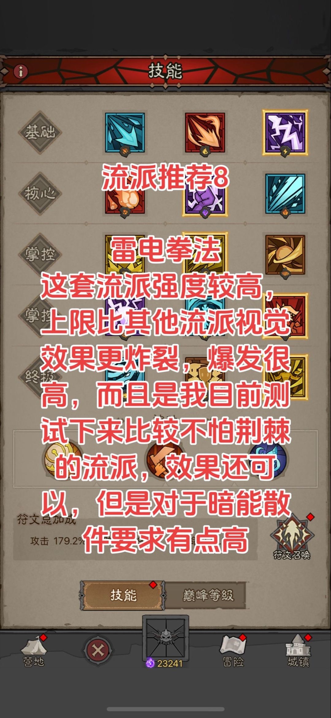 点我看往期攻略 攻略讨论裙:1009514497 一、技能搭配 基础技能:火焰波-爆破(叠易伤) 核心技能:闪电拳-雷电拳 掌控技能1:闪现-背刺(因为雷电拳的攻击距离太短,需要利用闪现来回闪到怪的背后输出) 掌控技能2:闪电球-电解(拉高触电层数) 终极技能:以太之躯-滚雷(叠加触电层数,拉高暴伤) 被动技能:能量亲和、强盛、唤法 二、暗能装备 武器:命运交织(拉高极速,极速拉起来了基础技能的易
