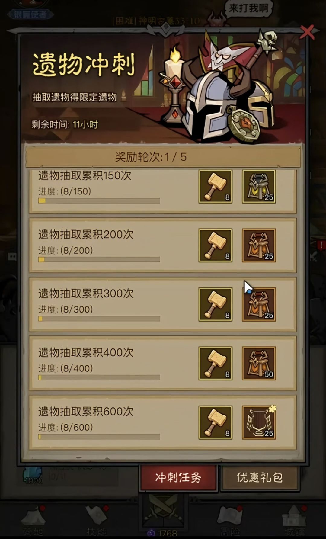 点我看往期攻略 攻略交流裙:1009514497 那首先注意呢,这个一物冲刺,它跟第7天开的遗物奇遇并不是同一个活动,奖励是不一样的 第16天的遗物冲刺: 达到200次,只有25碎片 达到300次,可以拿到一个橙色的自选 达到400次,可以拿两个的这个橙色遗物自选 达到600次,就可以有25个红色碎片 200-300这个两个档性价比不高,0氪低氪建议做到400次拿两个橙色自选才是性价比最高的,如果