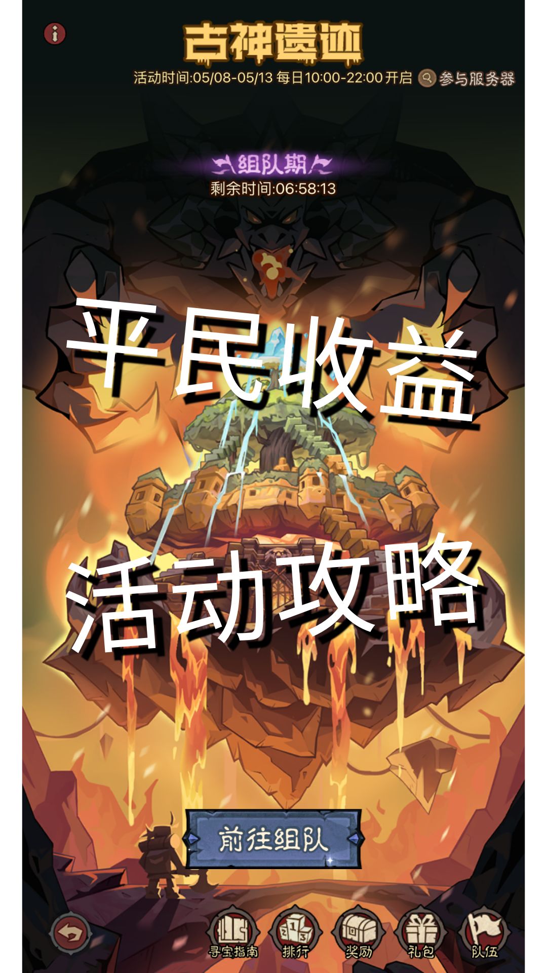 🔥 来了来了!古神遗迹活动它又来了,作为第二次开启的活动,有许多玩家可能是第一次参与,本文将通过活动介绍和活动攻略两个方面介绍古神遗迹以及如何最大化收益!(内容更新) 👉 活动介绍 一、玩法机制解析 ✅活动周期与组队规则 活动持续3天,每日10:00-22:00开放组队挑战,需3人队伍协作探索遗迹 层数机制:遗迹共分3层,每日初始进入第1层,需消耗遗迹地图逐层探索(第1层消耗2张,第2