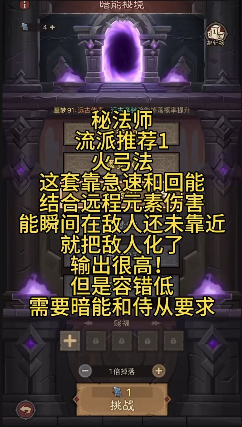 秘法师火眼流燃烧大地 攻略讨论裙:57280369 一、技能搭配 基础技能:火焰波-爆破 核心技能:寒冰光束-火眼 掌控技能1:闪现-背刺 掌控技能2:冰霜盾-熔火 终极技能:冰雹-天火 被动技能:强盛-能量亲和-唤法 二、暗能装备 核心暗能套装:永夜两件套 武器:巫妖之骸(命中敌人有25%概率生成一颗随机元素飞弹对敌人造成30%攻击的元素伤害,并恢复1点能量。这里高频伤害触发回