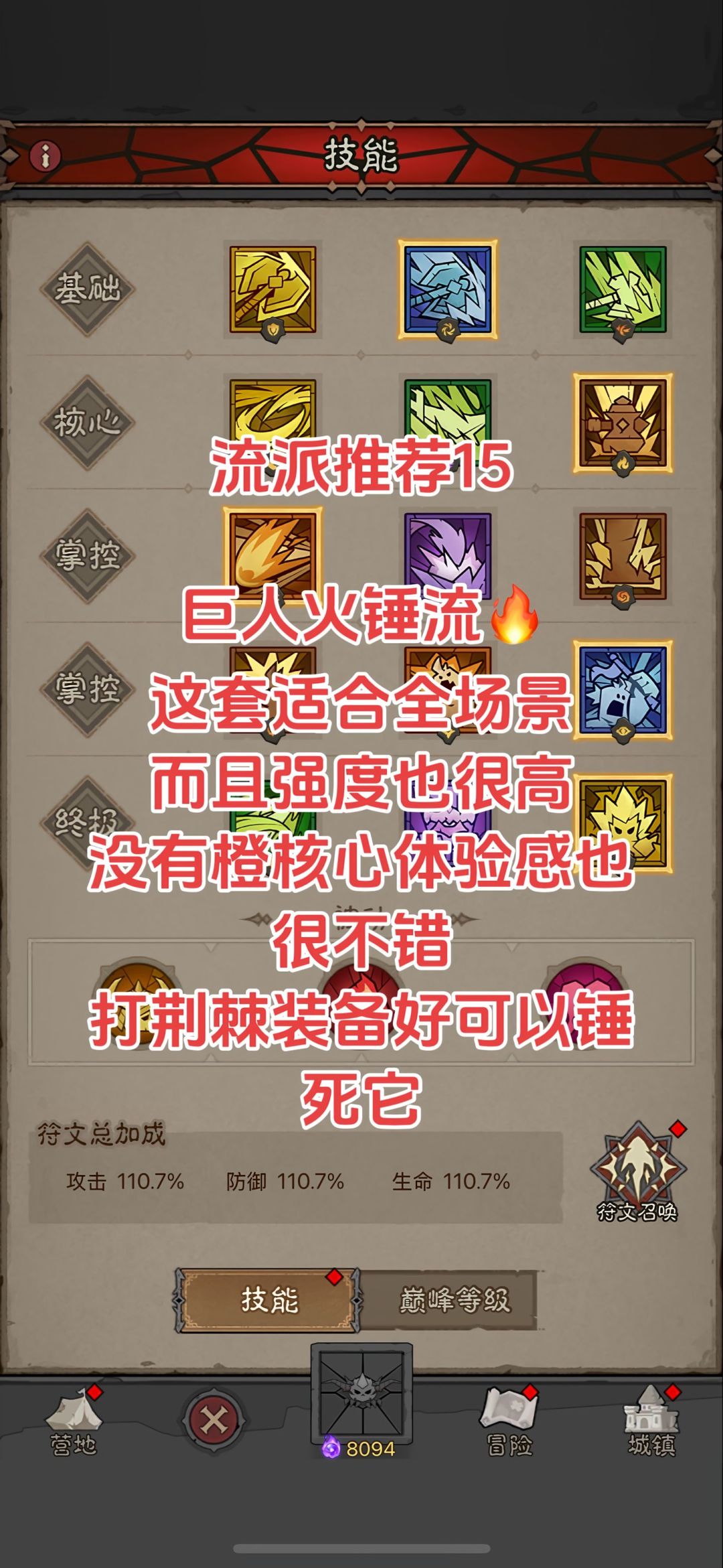 点我看往期攻略 攻略讨论裙:1009514497 一、技能选择 ·基础技能:狂乱—难遏 思路:叠加更多狂乱层数,通过增加急速属性,加快火锤动画播放速度 ·核心技能:原力锤—狱火 ·掌控技能1:冲锋—擂鼓/践踏—强劲 思路:冲锋—擂鼓用于群怪环境,如暗能秘境等,聚怪同时提供能量恢复,也可以在PK时提供免控效果;践踏—强劲用于处理单体BOSS场景,减少终极技冷却时间,增加最终伤害并提供易伤叠层。 ·掌