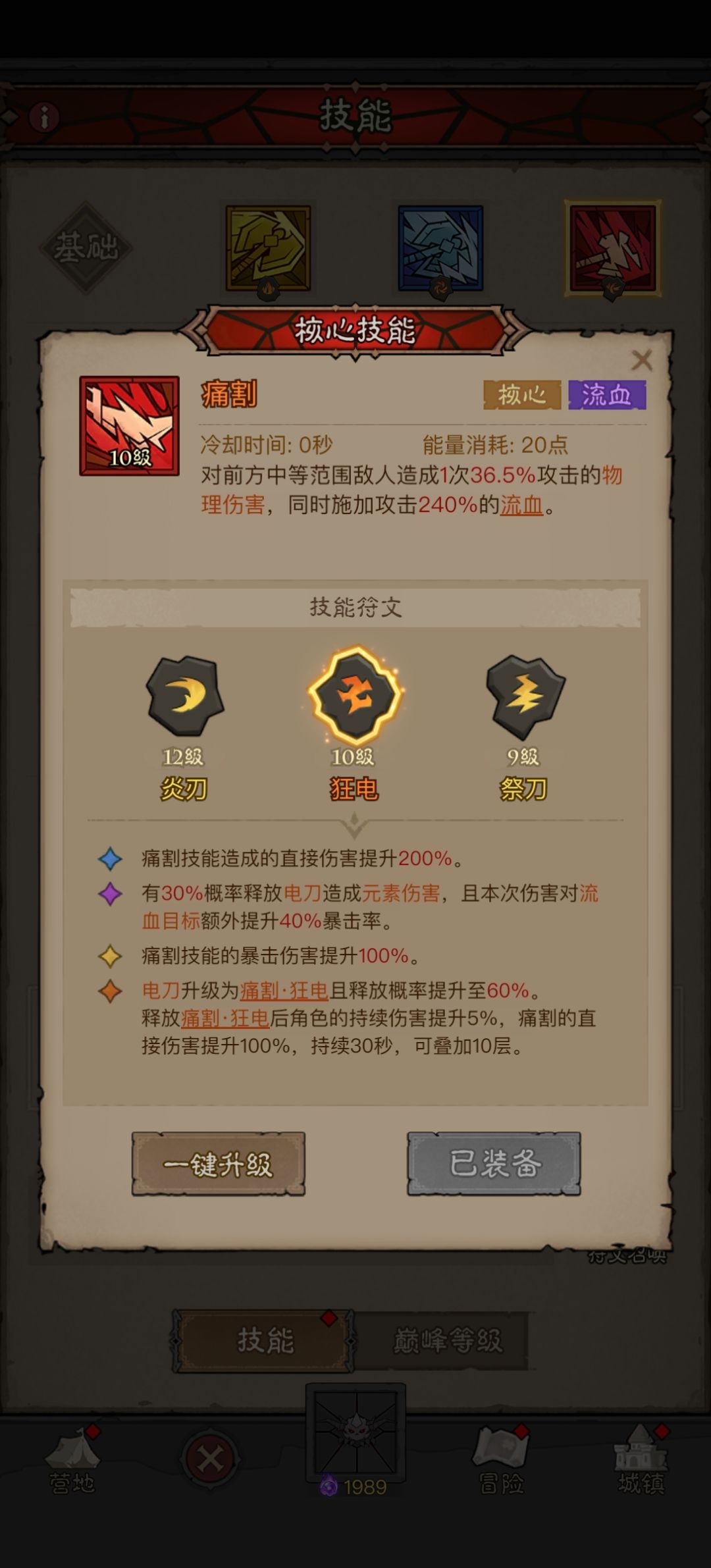 #英雄没有闪攻略 电割十层伤害提升非常夸张,而且流血带来的伤害也非常的可观,但是很多人觉得叠加慢,打BOSS时间有限,这里就不得说一下电割的最重要的一点,那就是无限能量。电割有三件非常重要的暗能装备,第一件就是血吼战符,它能让你在释放终极技能时加50点能量和50点能量上限,第二件混沌风暴,穿刺技能作为终极技能本身就只有16秒的冷却,有了这件装备可以把它的冷却降低到5-6秒,到这里基本就可以形成无