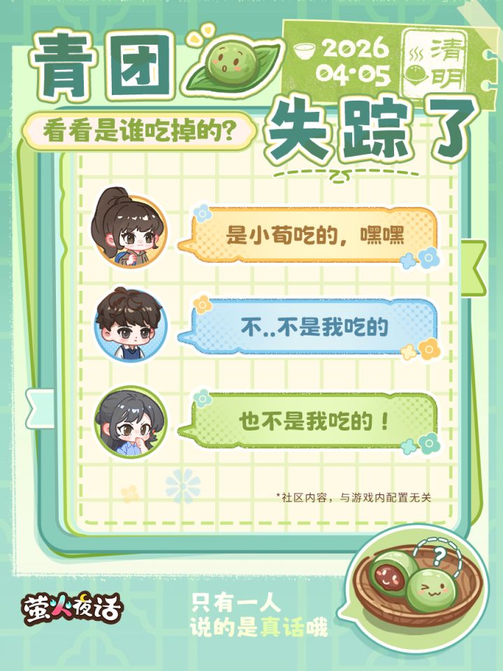 今日是#清明 ,雨洗春山,雾气中蔓延的土壤气息,正如记忆深处那份思念的引子,打开尘封的记忆,牵起万千思绪~“燕子来时新社,梨花落后清明。”除了清幽的花香和泥土的芬芳,今天空气中还缭绕着青团的气息~聪明的大家来推理看看,究竟是谁先吃掉了一粒美味青团呢?只有一个人说的是真话哦! 🎁口令码🎁:清明节福利有效期:4月7日23:59前 🎈小萤温馨提醒清明节限定活动及礼包已开启,仅此一天,别忘参