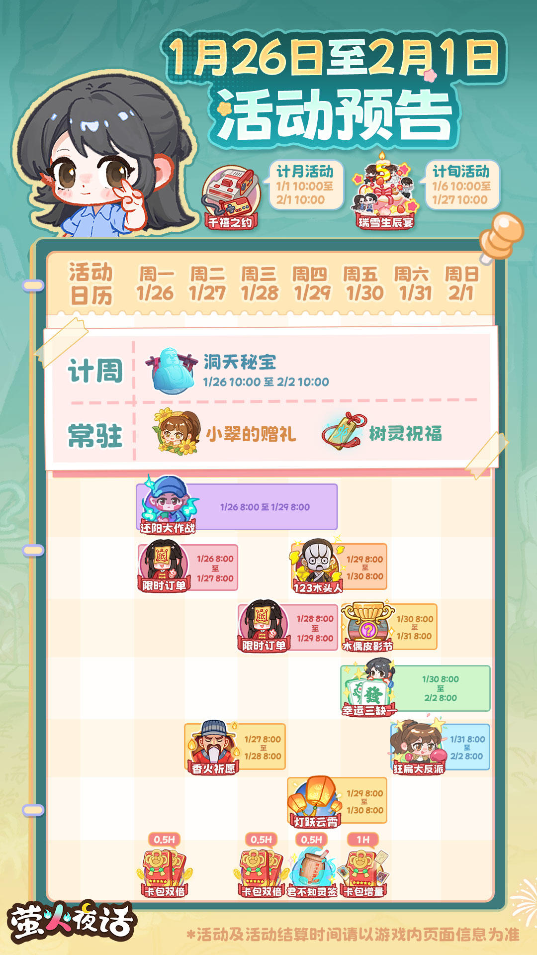1月的最后一周来啦,快来看看这周的活动安排吧!「瑞雪生辰宴」即将在本周二结束,「千禧之约」集卡活动也要接近尾声了小萤偷偷告诉大家很快就会有全新计旬活动和新一套卡牌上线哦!大家猜猜会是什么风格嘞?嗯~小萤好像嗅到一丝年味飘来咯٩(•ิ˓̭ •ิ )ง #萤火夜话 #纸嫁衣平行世界 #纸嫁衣