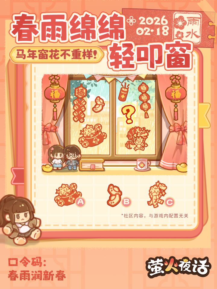 今天是#雨水 ,也是大年初二~咱们也要贴满窗花才有春节氛围嘛!小萤请大家帮忙看看,哪张贴上去,才会得到一窗完全不重复的窗花嘞?雨水专属🎁请查收:口令:春雨润新春内含:体力*100,豪华吉星盒*1有效期:2026年2月20日23:59前#萤火夜话 #福马新春版本 #纸嫁衣 #休闲游戏 #雨水