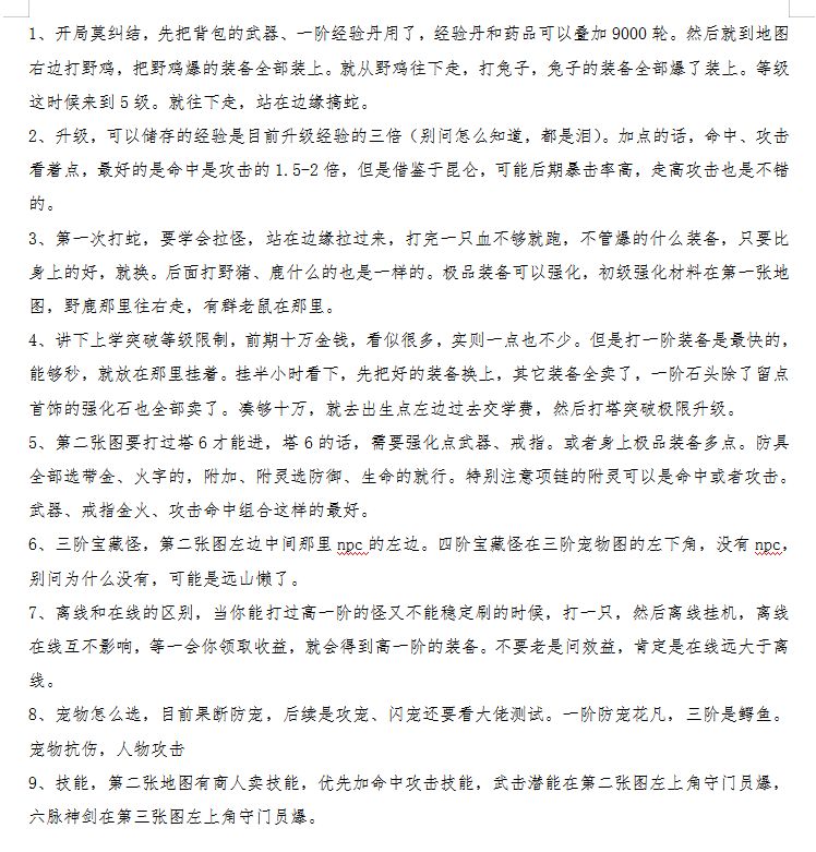 [升等级]经验基本上丹药,刷怪前尽量吃满,升级前10级加攻击,后面全加命中。 [刷装备]无宠兽前不必刷极品,能用就行,快速刷高阶的装备。 [宠物]先刷个生命高的防宠,防具就可以随便带个金火了,宠物一阶不用养,快速过关,打不过再升阶宠物,尽量搞最高阶的宠物,遇到极品先升+2带吃亲密丹。推荐刷一防二攻,打Boss一防一攻,刷小怪双攻。 [离线挂机收益]挂一种东西,如摄灵石,当背包里数量为零时,挂满60