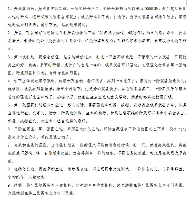 先加群,想发育快点的吗买10个令牌, 开局去商店买两个戒指和项链,然后全部装备上,背包经验丹和烧鸡全用了,就去附近找怪刷,前期全点攻击打怪快,15级后全点命中,这游戏命中很重要,投掷武器(无伤打怪)需要命中,随随便便刷点就能去刷一阶装备了,不用看五行,主要看附加属性,防具选防御,戒指武器项链选命中和攻击,然后一阶随便刷点就去刷二阶,二阶强化石和升阶石全卖了,三阶打不过再留点强化,商店买技能学,有什