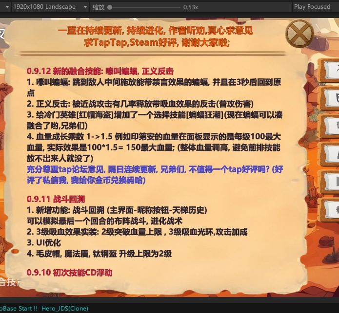 请看更新日志;另外给大家加了一个小功能, 布阵完点击"GO"之后, 有一个镜头拉进的过渡; 就是不清楚大家是喜欢镜头拉进一点好观察英雄,还是远一点看全局;要不我把这个镜头做到设置里面自由设定?金币商店的广告看一个30金币哈; 虽然不多, 那也等于赢3盘的收货咧;
