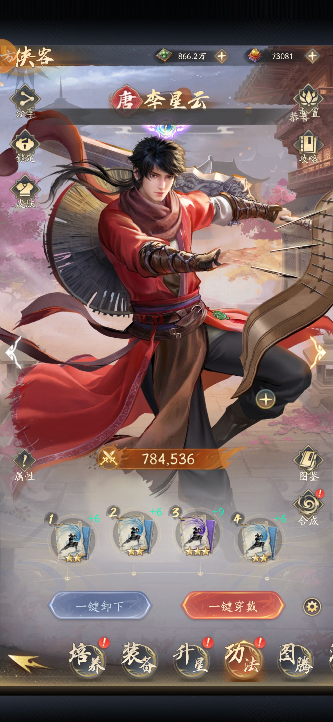 看到大家都评论说特别想知道每个侠客怎么搭配的,来啦来啦[表情_开心],我就拿我自己的搭配给大家讲一讲,大家可以参考一下: 1.功法:李星云天罡绝,阳叔子、霸雪五雷天心,降臣殒生(其他的也凑不齐),许幻天罡(还没凑齐一套),女帝幻音。功法的选择性不多,基本上看技能就知道带什么了。