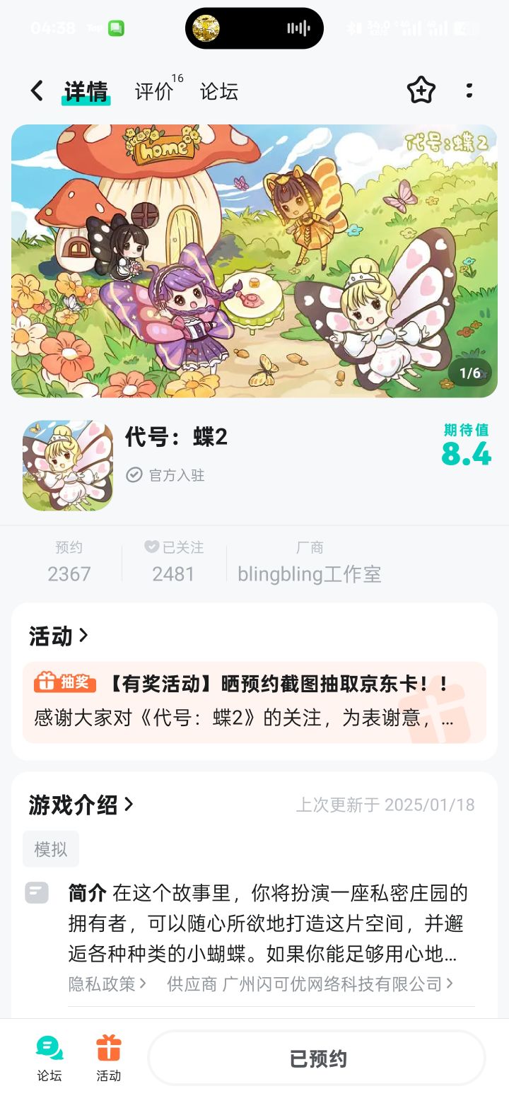 感谢大家对《代号:蝶2》的关注,为表谢意,特在此开启一轮抽奖活动,活动明细详见下方!参与方式:在评论区晒出在TapTap平台成功预约《代号:蝶2》的截图,即可参与抽奖哦!活动截止时间:2025年4月23日08:00开奖时间:2025年4月23日10:00奖品详情:活动截止后,我们将从评论区随机抽10名用户送出50元京东卡1张。注意事项:参与活动的评论内容请符合上述的参与方式以及平台内容准