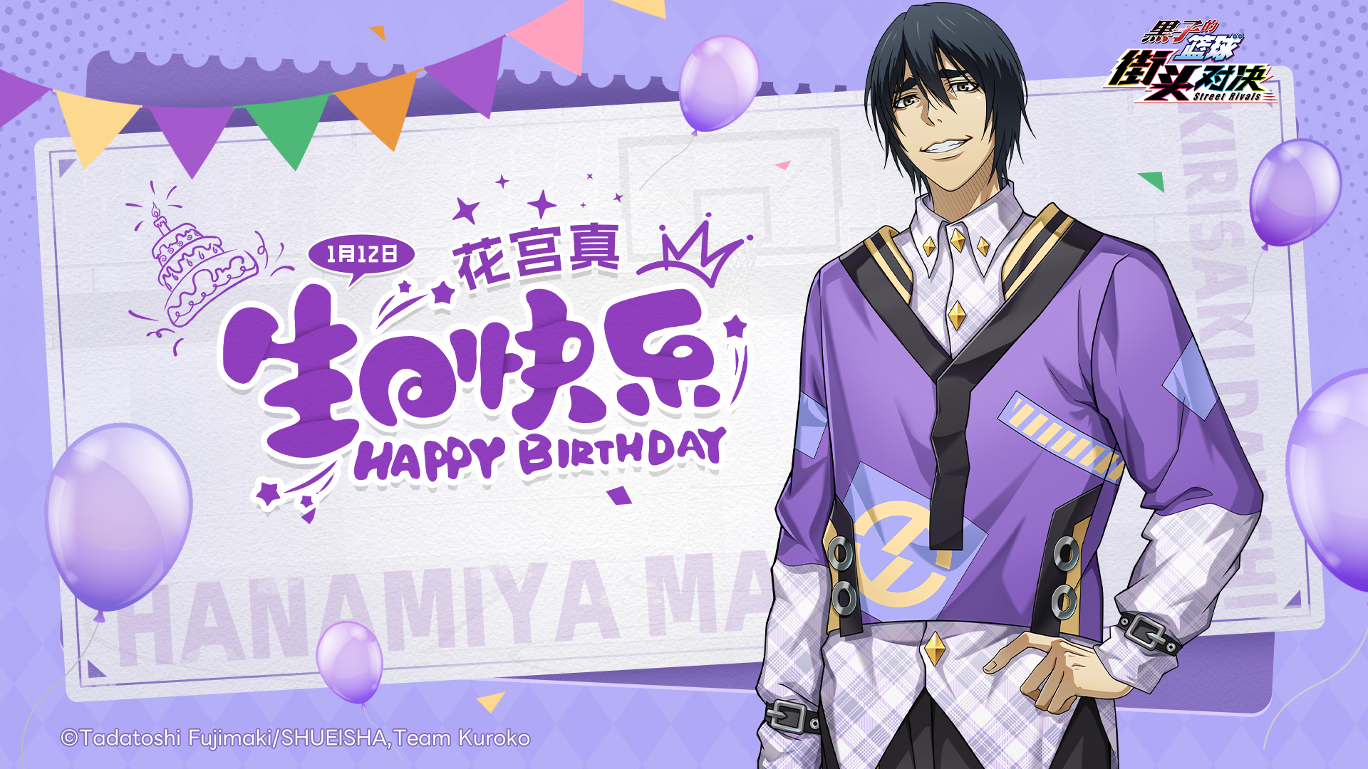 叮!《黑子的篮球:街头对决》球员生日祝福准时上线!在充满热血与激情的球场之外,我们也铭记着每一位球员重要的日子。今天是1月12日,是花宫真的生日,让我们共同为他送上最真挚的祝福!生日快乐!花宫真!他是“无冠的五将”之一。擅长策略,厌恶纯粹热爱篮球的人,故意采取非常规的手段和粗暴的打法来扰乱比赛。但却在《黑子的篮球:街头对决》因为其独特的魅力和玩法,有着一批忠实的粉丝。同时,小葵也给大家带来