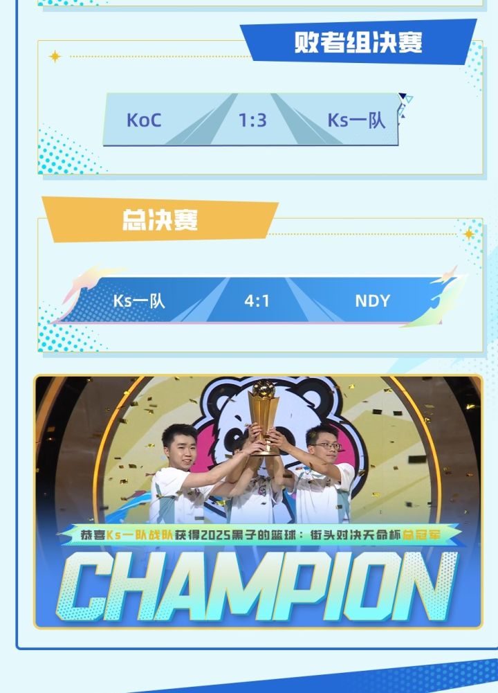 所有的等待,都是为了此刻的巅峰。所有的对决,都是为了最终的加冕。当最后一记投篮划过天际,天命所归,新的传奇自此诞生。我们荣幸地宣布:《黑子的篮球:街头对决》天命杯总冠军是:【Ks一队】!从群星璀璨的八强赛,到竞争激烈的四强赛,直至最终的冠军之战。他们将实力与默契展现的淋漓尽致,这座沉甸甸的奖杯,是对他们实力与汗水最好的褒奖。让我们再次为天命杯冠军献上最热烈的掌声!同时,我们也致敬所有
