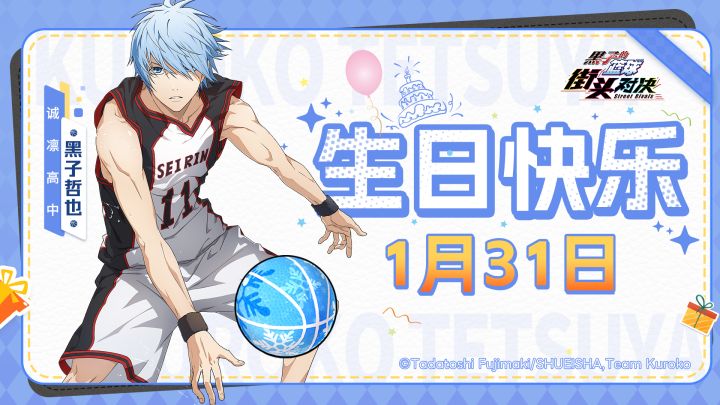 叮!《黑子的篮球:街头对决》球员生日祝福准时上线!在充满热血与激情的球场之外,我们也铭记着每一位球员重要的日子。今天是1月31日,是黑子哲也的生日,让我们共同为他送上最真挚的祝福!生日快乐!黑子哲也!原帝光中学的奇迹的时代第六人。凭借天生的薄弱存在感,练就了独特的技术‘视线诱导’,总能在对手未察觉时将球精准送到队友手中。进入诚凛高中后,不仅延续了传球的使命,更开发出‘消失的运球’突破防守,以