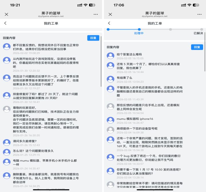 大家好,我是《黑子的篮球:街头对决》S1开服玩家,每天坚持上线,从未断签。从 1月11日开始出现严重BUG:• 每日签到页面消失一个多月• 主界面加载不全、活动入口异常、功能缺失• 每次登录都要反复刷新才能勉强使用这一个月里我做了所有能做的:• 按客服要求上传日志、重装游戏、换多台设备(iPhone/安卓/模拟器)• 多次在微信客服反馈,对方只会敷衍“正在处理”• 2月2日发正式邮