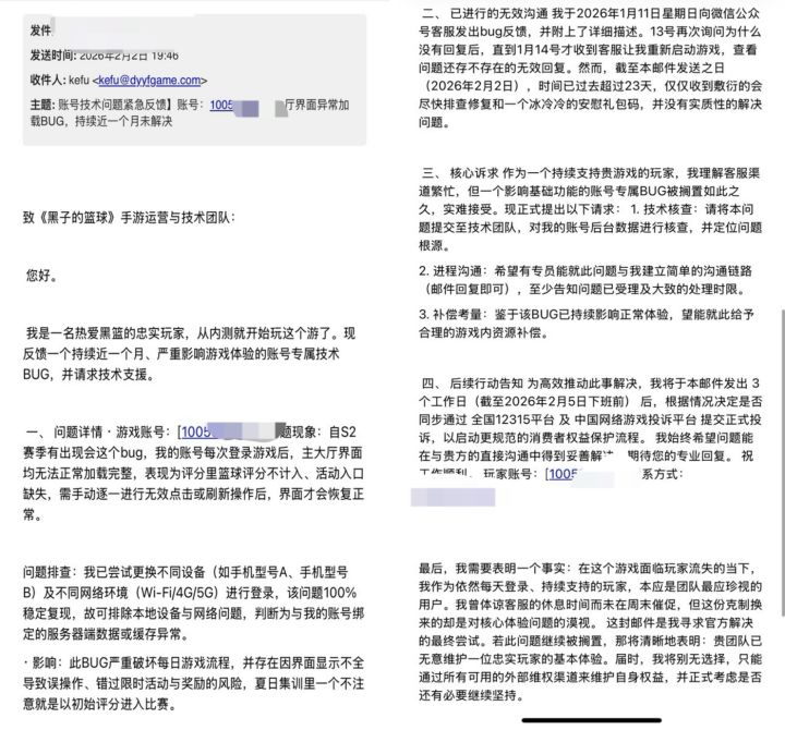 大家好,我是《黑子的篮球:街头对决》S1开服玩家,每天坚持上线,从未断签。从 1月11日开始出现严重BUG:• 每日签到页面消失一个多月• 主界面加载不全、活动入口异常、功能缺失• 每次登录都要反复刷新才能勉强使用这一个月里我做了所有能做的:• 按客服要求上传日志、重装游戏、换多台设备(iPhone/安卓/模拟器)• 多次在微信客服反馈,对方只会敷衍“正在处理”• 2月2日发正式邮