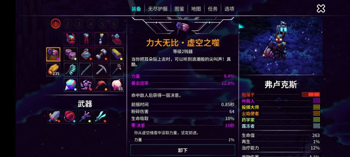 虚空套件相当容易获得,所有的部件都是来自任务,无需刷材料,探图做支线的同时就可以完成。 具体一点的途径,钥匙开局的虚空任务就可以获得,结晶需要将小小的狂热信徒送进虚空,裂空需要刷机器人凑齐碎片,而法杖需要击败支线boss虚空大弟子。(刷机器人获取碎片需要接到任务才能够进行) 具体效果图片中有展示就不做赘述。 触发原理是:虚空锤站撸,增加契约伤害和叠加层数触发法杖和裂空,钥匙将受到的伤害缓存,