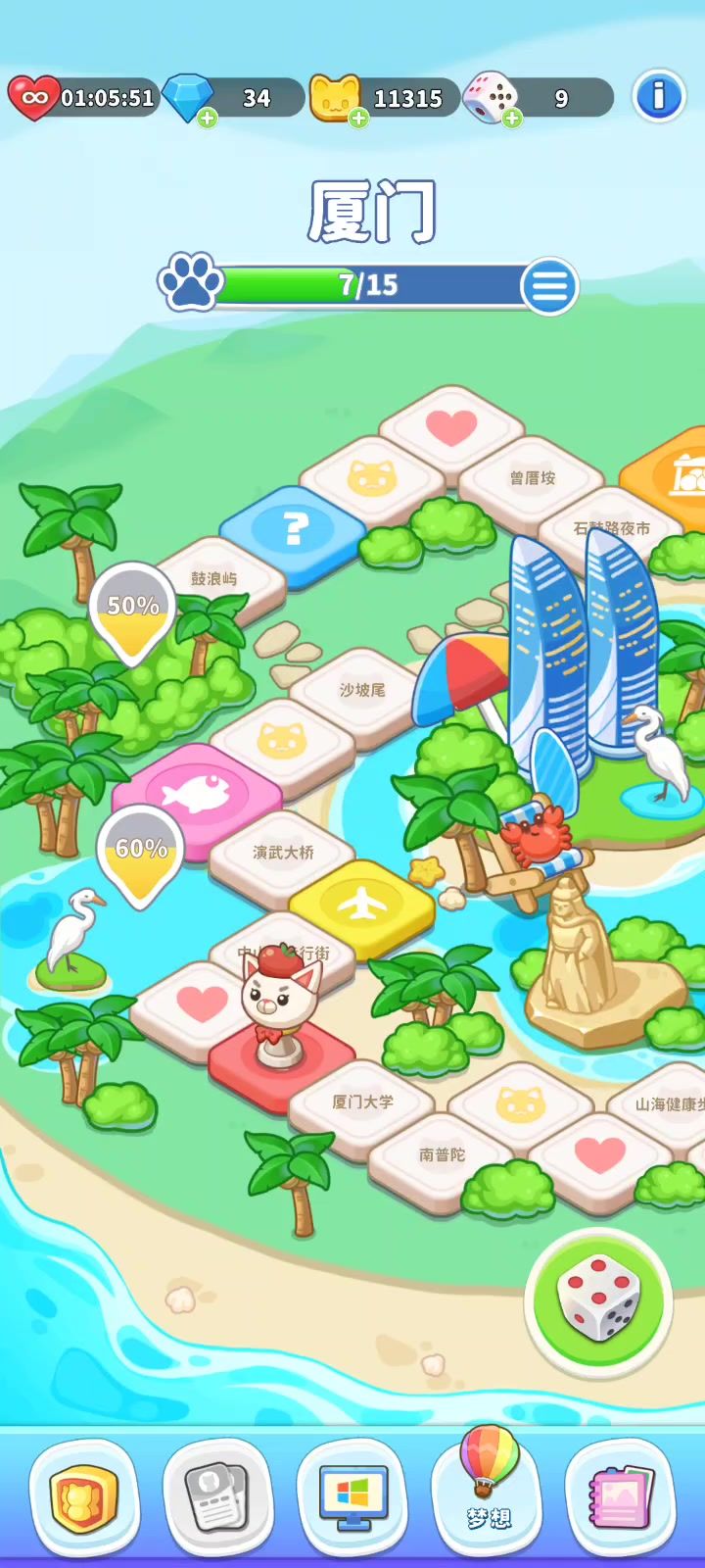 🎲 掷骰环游世界: 从厦门海边漫步到魔法学院!自由切换特色城市地图,每一步都是新鲜风景!🛍️ 收集当地特色: 每到一地,去发现专属当地特产!不仅是纪念品,更是解锁成就、兑换奖励的珍贵资源!⚡ 补给与机遇:🪑 落脚歇息,补充体力/金币,为下一程续航!👫 偶遇神秘旅伴: 触发暖心相助、趣味挑战或隐藏剧情事件!🧙 撞见古怪“神棍”: 准备好!快问乱答挑战突袭!答对惊喜连连!🎭 命运的岔路口: