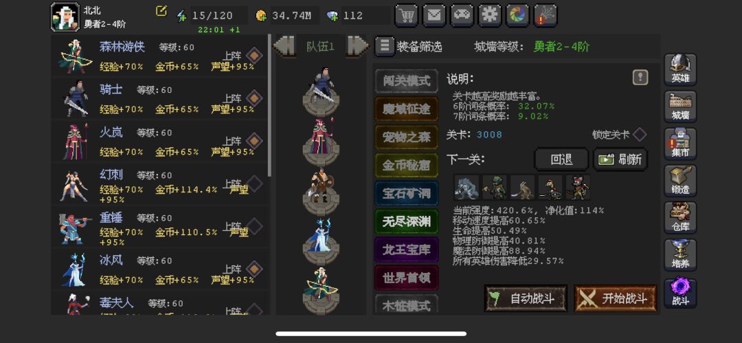 首先是英雄和阵容 骑士(技能10.15.15.15),森林游侠(技能5.15.15.15),刺客(技能5.15.15.15),冰风(技能15.15.5.15)(前期毒夫人),火岚(主力)(技能15.5.15.15) 技能进阶 主力满。 辅助,全队>加怒>加伤>控制 主力是说60关后 ,前期都一样。 没到关卡60前,有什么好装备直接换,可以给一个英雄弄套每3秒强化普攻。 商场里,宝石和灵石都买,装