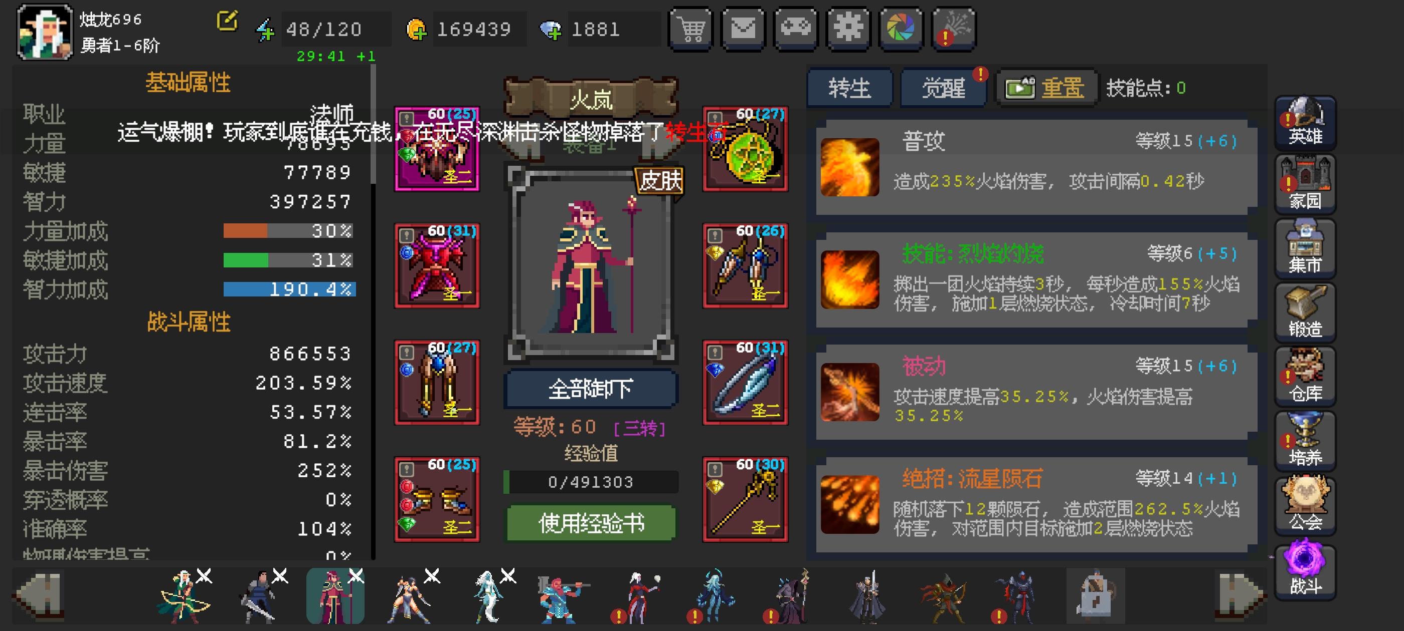 氪了1500,啥垃圾都买但是提升不大,后悔了建议别什么技能石,宠物礼包都买,微克建议先把主c的转生提上去才是王道 所以主买转生石礼包 我用这维京,火法带3工具人 大概说一下,我的随意玩法吧! 工具人骑士,刺客,森林游侠(这3只都是给主c加buff的)所以工具人宝石也不太需要装 维京单体打王,火法打小怪 工具人项链戒指都用有加技能等级的,加队友buff是哪招就带哪种 主c装备都要洗蓝色字那个buff