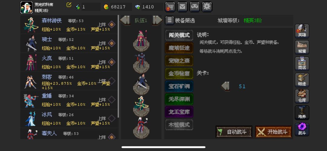 首先是英雄和阵容 骑士(技能10.15.15.15),森林游侠(技能5.15.15.15),刺客(技能5.15.15.15),冰风(技能15.15.5.15)(前期毒夫人),火岚(主力)(技能15.5.15.15) 技能进阶 主力满。 辅助,全队>加怒>加伤>控制 主力是说60关后 ,前期都一样。 没到关卡60前,有什么好装备直接换,可以给一个英雄弄套每3秒强化普攻。 商场里,宝石和灵石都买,装