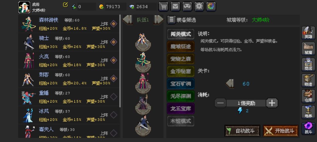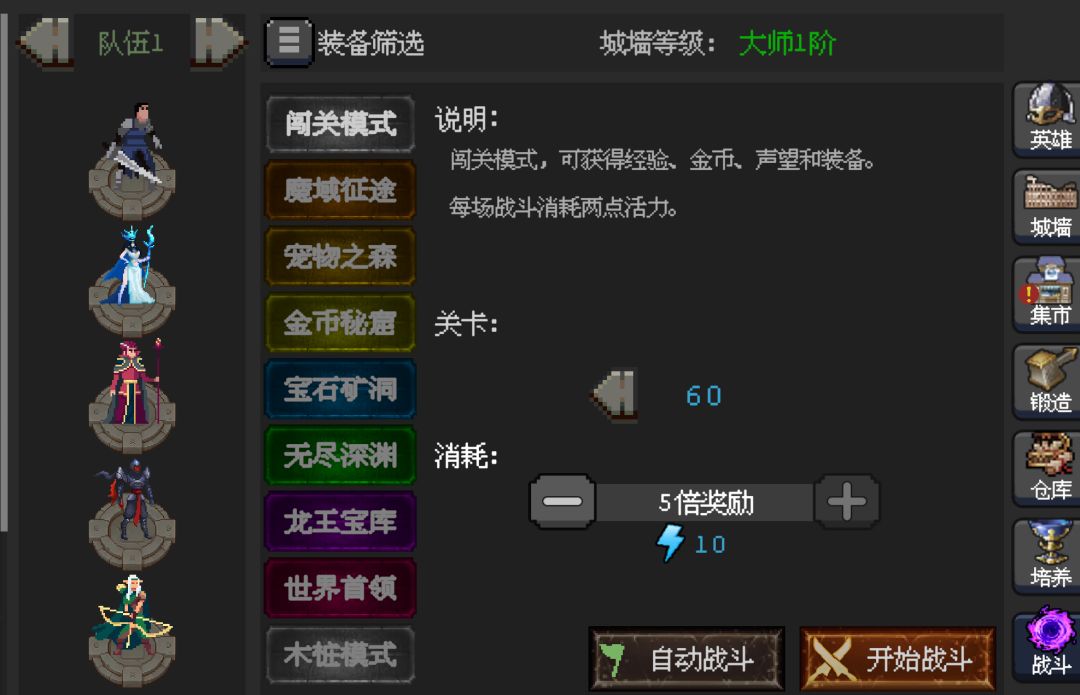 1.这游戏不氪金就得肝,猛猛看广告,每天广告有限制,只能看30个。看90个就差不多了后面奖励随缘看。 2.前期主c推火法,60关后有幽冥术士也是个主c。 3.等级低的装备建议留一套打练级达人用来新给的英雄练级。有淘金者的装备也别丢,留着,刷金币用。商店刷新的装备等级和关卡相关。 这游戏活力太难得了,除了每天固定的就只有氪金了,闯关失败不返活力,切记别浪费。 后续能白嫖的英雄还获得,到时候试试强度继
