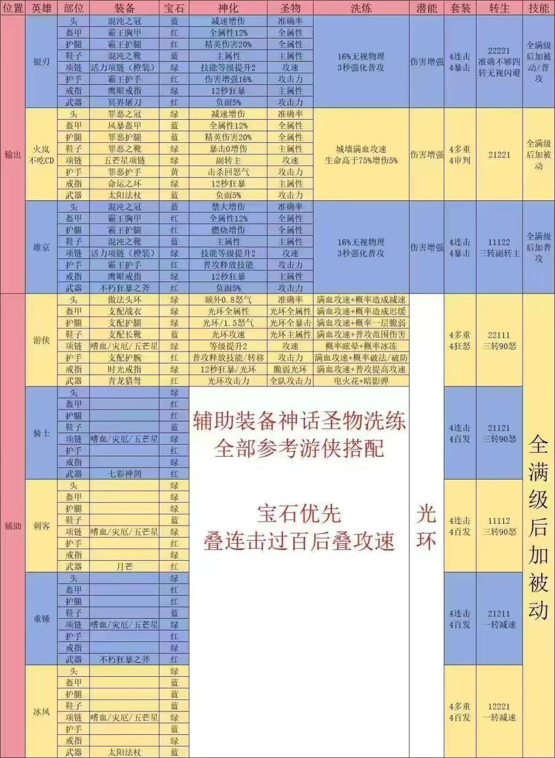iOS1区的 总的感觉还行 优点是这游戏很省心可以自动战斗 装备全靠刷 碎片时间就能玩 缺点是满地的氪金元素提醒 说回正题 培养方向 目前看来阵容里3个buff手雷打不动 骑士 游侠 刺客 其中骑士建议优先给最好的装备 主要是没有弹道出手迅捷 大招全屏也能有效缓解小怪压力 输出在3辅助里最优 最不用装备就是游侠 技能几乎全是团队buff 装备给减cd就行 另外两个自由人 其中一个推荐火法 主要是