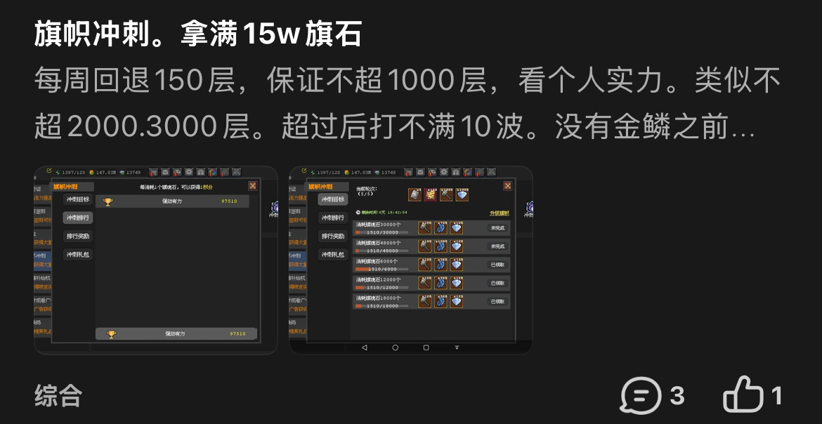 每周回退150层,保证不超1000层,看个人实力。类似不超2000.3000层。超过后打不满10波。没有金鳞之前6000旗石一轮,拿满3w旗石。现在要想拿满5轮奖励,需要15w旗石,但是每天买满次数也还是不够15w,冲刺轮回1星期换,那么旗帜冲刺轮回天数是21+7本身,28天x4400(每天买满次数)123200,才12w要想拿满旗帜冲刺奖励还差3w只能氪金。当然如果只能4轮奖励只需每天打3次龙王