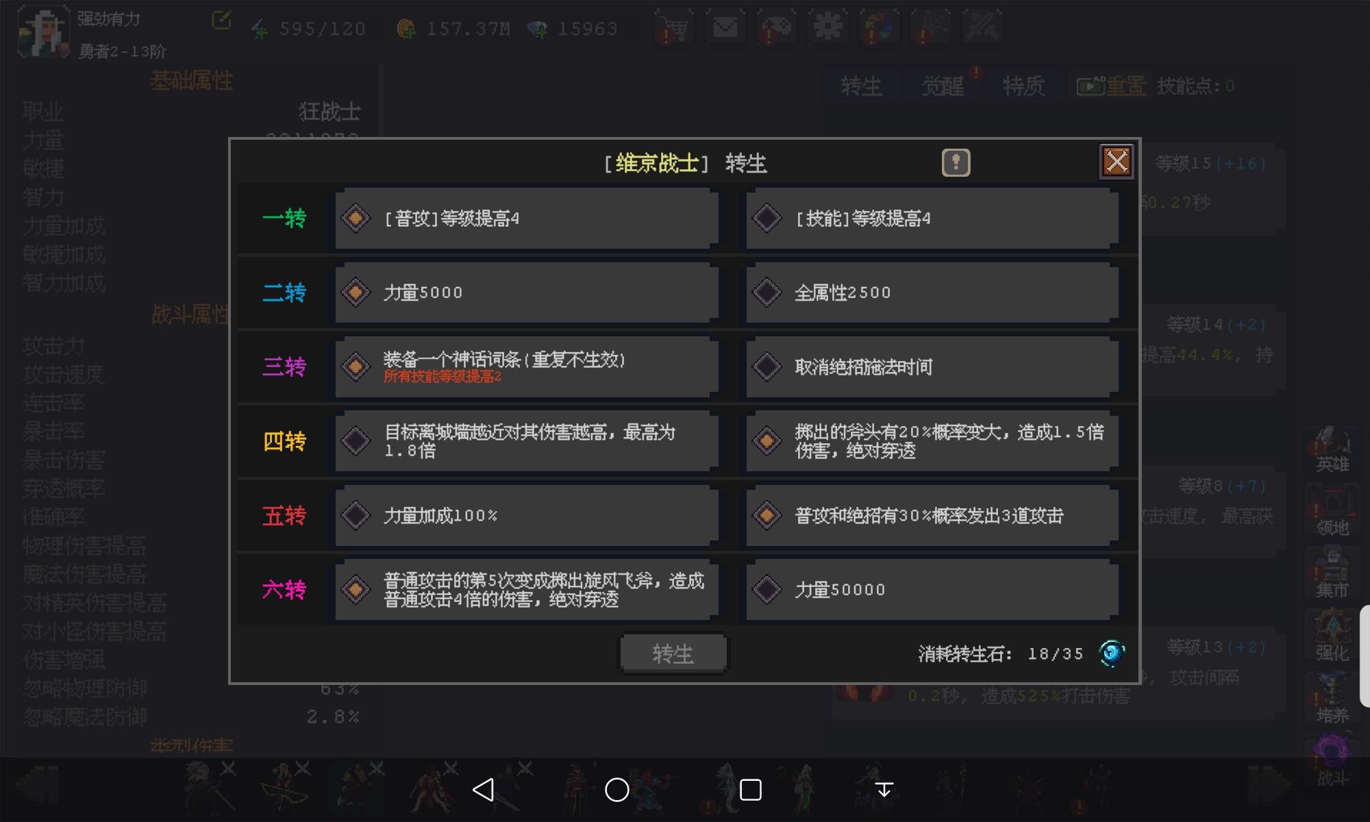 玩了有快半年时间了这游戏。从刚开始的零氪-免广告1转火岚。在无尽500时转维京,到现在。转生石除了充1000送的。就开始屯着。3转银刃3转游侠辅助维京过血缘。零氪也是能6转。只是要费时间而已。想快只能氪。熬不了游戏时间的,早点卸载吧!