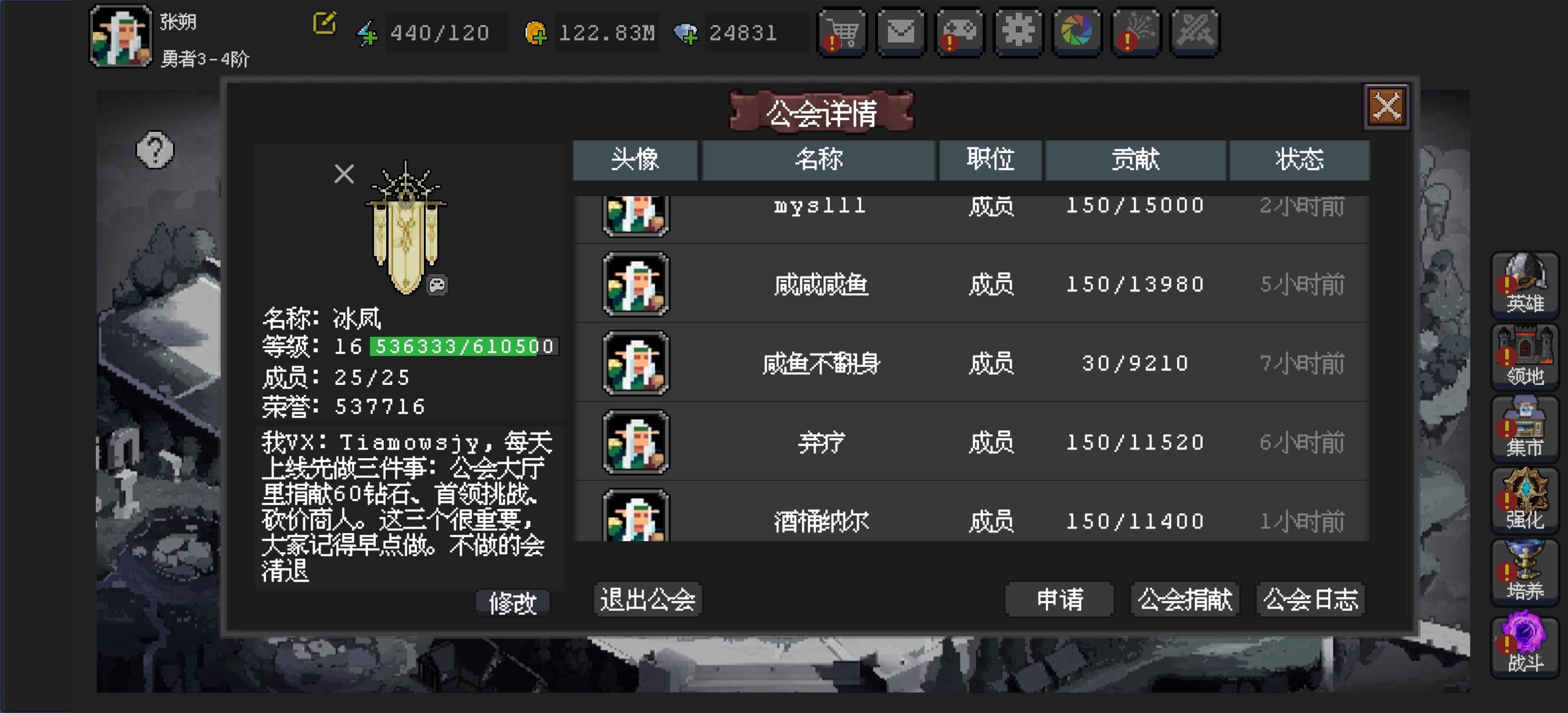 公会全员活跃,每天满捐献,砍价一般上午就能砍完。有微信群,群里氛围良好,大家经常会一起讨论游戏分享攻略,因为公会boss有排名的原因,收人稍微卡一下战力,有想加公会的朋友截图你的主c面板发在评论区就行,或者直接加我绿泡泡:Tiamowsjy