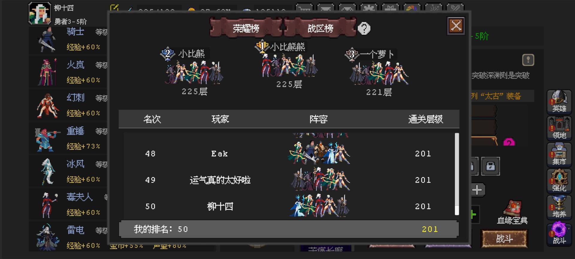 这游戏目前到201就算毕业了,有幸抢到了末席。目前为止这游戏只有两种人,一种是有红觉的一种是没有的。自从接触红银红毒的账号,一路直冲上了201,另一个火法号目前一直在165卡着。平民上161就算毕业了 ,200目前来看没有任何希望。上201的基础最低要2000Q。想上去的话,要么等官方再加一些乱七八糟的玩意,来提提数值。这游戏说白了就是一个数值游戏。