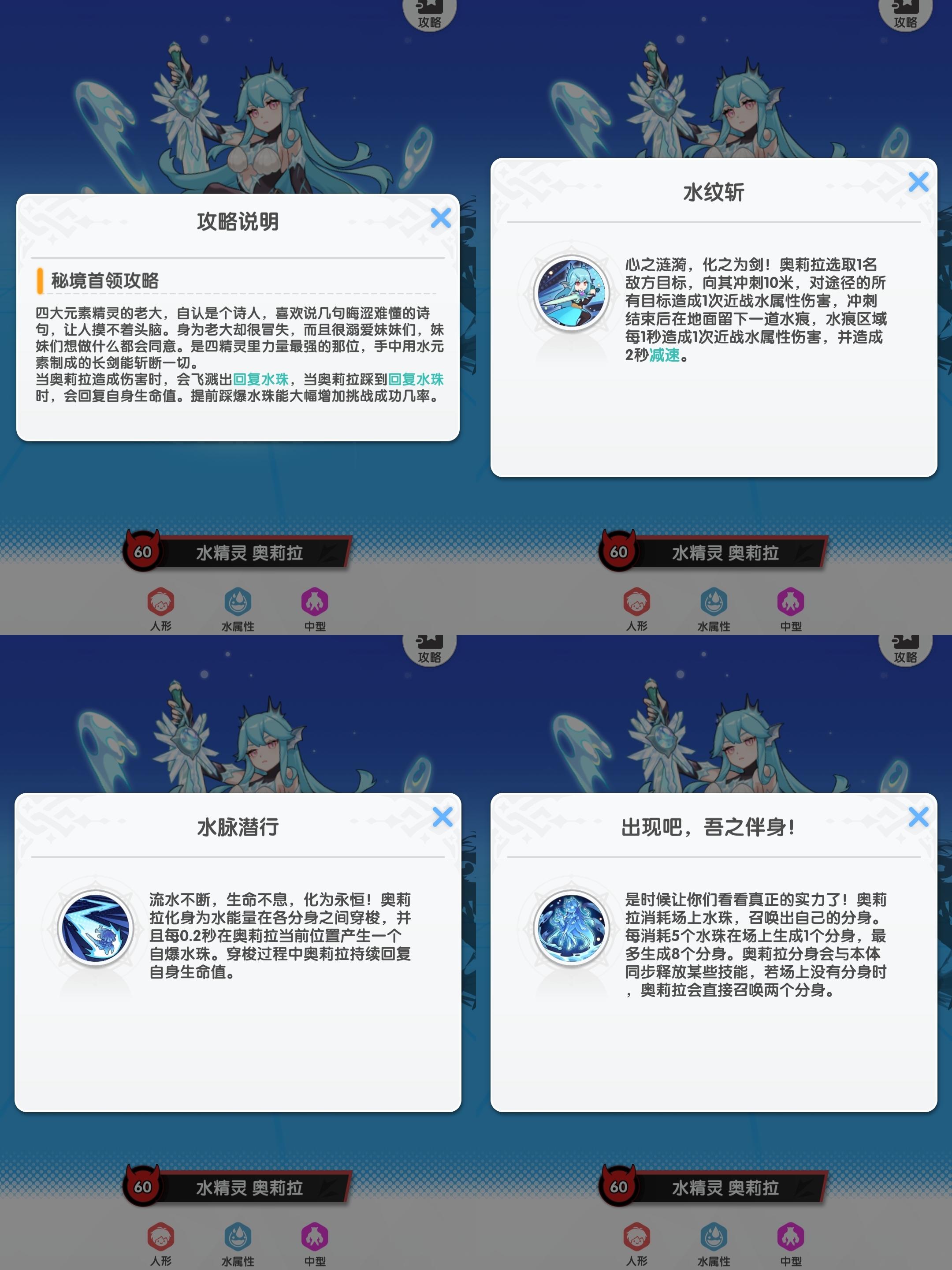 【仙境传说重生攻略】水精灵奥莉拉 通关攻略可能很多朋友都觉得水精灵机制太恶心了,总是打了很长时间,结果一个技能,血又回满了,接下来我就以自己的经验,给大家聊一聊,该怎么打水精灵。 核心情报 - 基础属性:人形/水属性/中型- 元素克制:风属性克制(150%伤害)、毒属性克制(150%伤害),火属性被克制(90%伤害)(所以法师尽量选择风元素技能,水元素和火元素技能,伤害会降低。而在所有