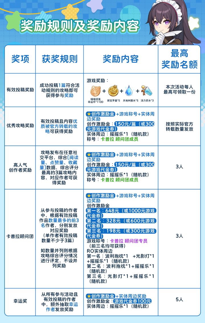 《仙境传说:重生》已于12月25日正式开启公测!公测即将1个月,大家对 重生 的了解程度怎么样了呢~如果你对游戏已经快速地上手,有一些领悟的“游戏技巧和玩法攻略”,并且愿意分享这些经验给其他冒险者,欢迎你加入「卡普拉公司特邀顾问团」我们将开启第一期《仙境传说:重生》攻略征集活动!为了感谢大家创作的热情和分享,卡普拉公司为大家准备了相当丰厚的福利内容,期待看到各位创作者的投稿,为更多冒险者提供帮