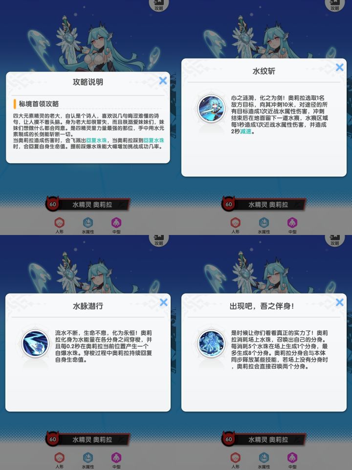 【仙境传说重生攻略】水精灵奥莉拉 通关攻略可能很多朋友都觉得水精灵机制太恶心了,总是打了很长时间,结果一个技能,血又回满了,接下来我就以自己的经验,给大家聊一聊,该怎么打水精灵。 核心情报 - 基础属性:人形/水属性/中型- 元素克制:风属性克制(150%伤害)、毒属性克制(150%伤害),火属性被克制(90%伤害)(所以法师尽量选择风元素技能,水元素和火元素技能,伤害会降低。而在所有